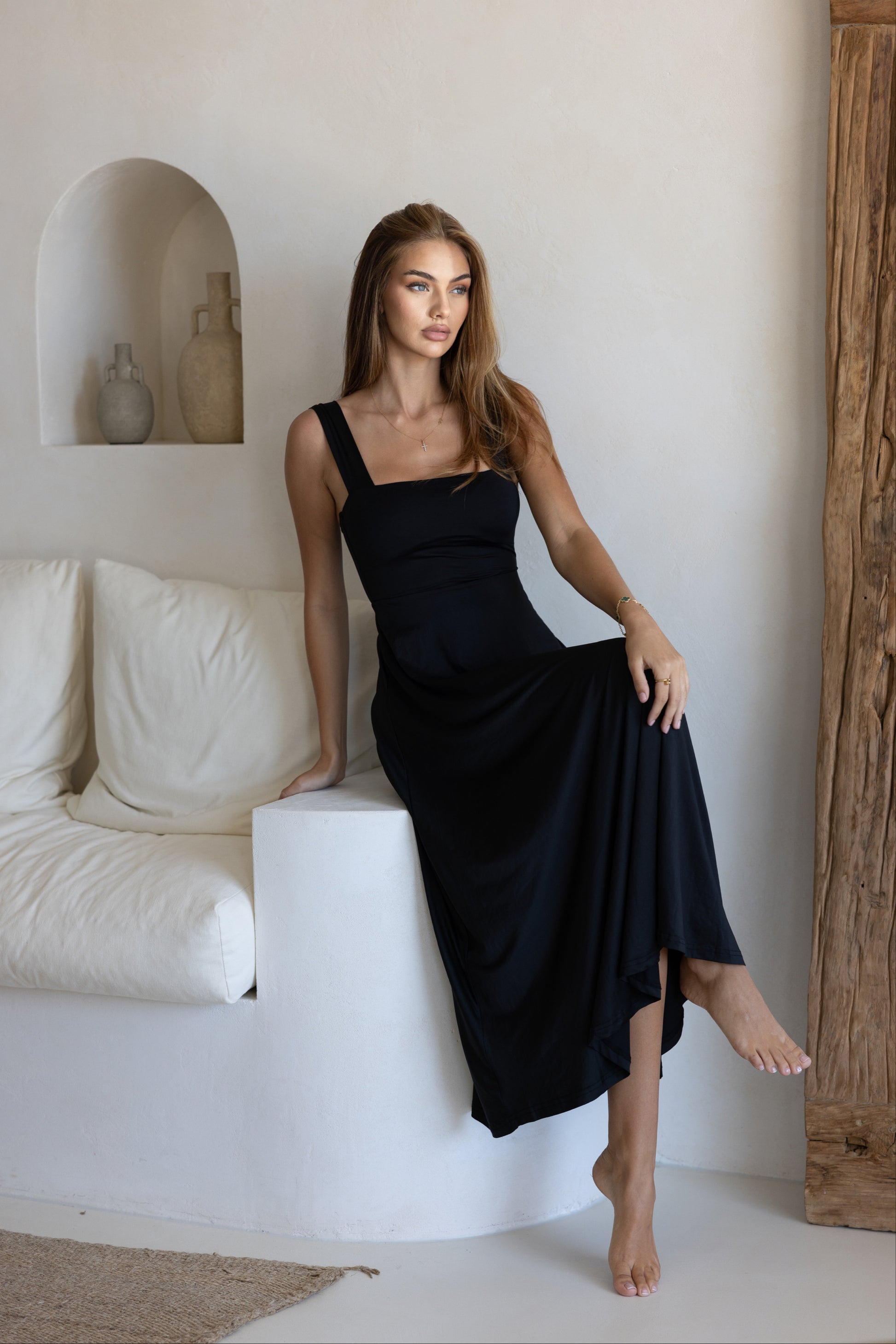 "Flatter your waistline and feel confident in our Luxe Box Neck Dress Midnight. With a double lined bust and available in 10 must have shades, this midi length dress can be worn alone or layered under a sheer dress for a versatile look. Perfect for lounging or a night out!"
